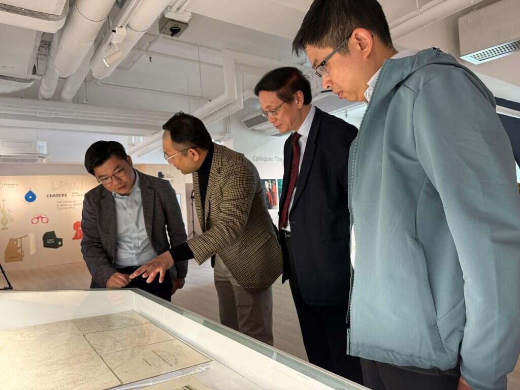 在韓鵬館長與馮錦榮榮譽館長的導賞下,劉啟業總館長與蘇柱榮館長仔細觀摩展廳中陳列的古典望遠鏡、星盤、古籍善本等珍貴藏品,並對展覽策展思路表示讚賞。雙方亦圍繞香港作為東西方文化交流節點的獨特背景,探討如何通過特展合作、學術研討及教育推廣等形式,促進香港科學博物館體系的專業發展與跨機構合作。