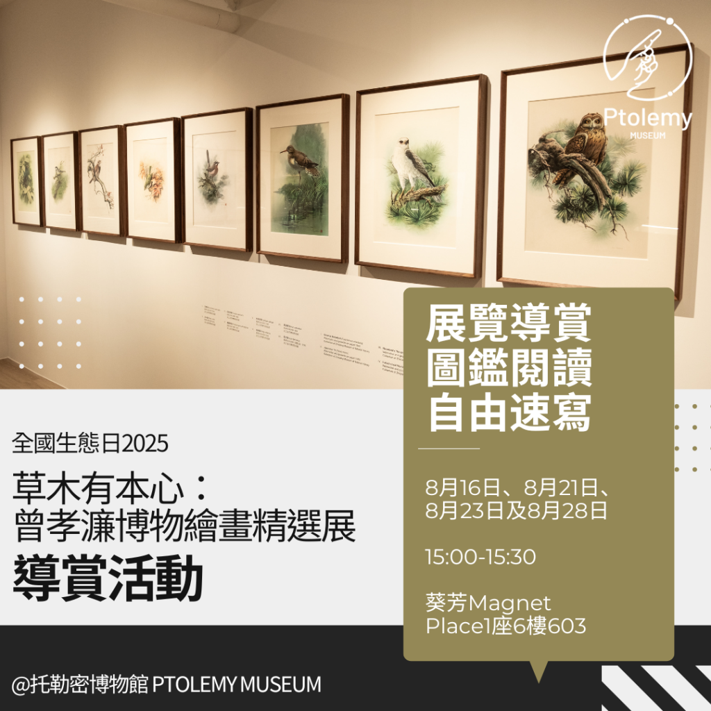 全國生態日2025要來了!我國將每年8月15日定為「全國生態日」,旨在提升社會對生態文明和環境保護的關注,並推廣「綠水青山就是金山銀山」的重要理念。為響應是次生態日,托勒密博物館特地增設4場導賞活動,由專業導賞員向大家講解「草木有本心:曾孝濂博物繪畫精選展」的生態博物畫作及相關展品,包括植物誌、郵票、圖鑑等,讓大家了解博物畫是什麼,並介紹香港與鄰近地區的本土生態。