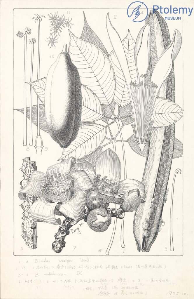 木棉和長果木棉 Bombax spp. 植物墨線圖(毛筆) 1975 浙江自然博物院收藏