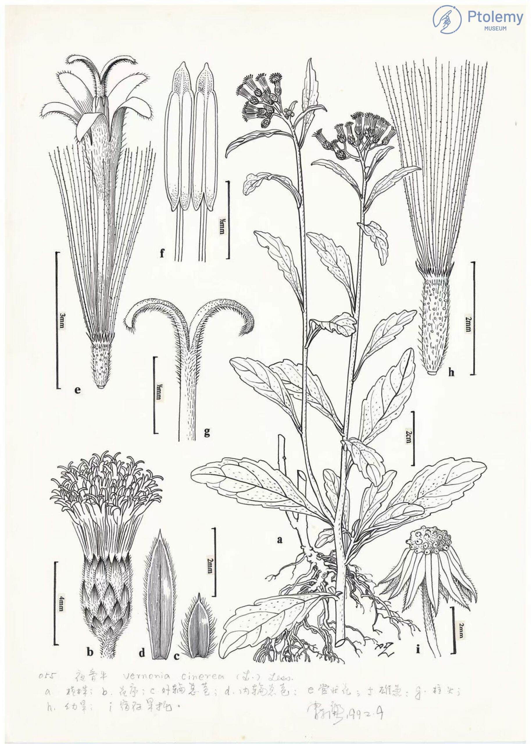 夜香牛 Cyanthillium cinereum 植物墨線圖 1992 胡秀英植物標本館收藏