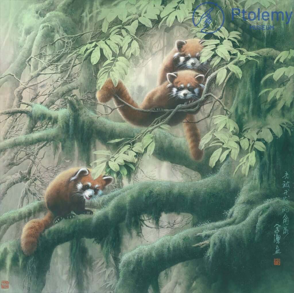 小熊貓通常單獨、成對或小羣活動,多個出現時往往是雌性帶着幼崽。這幅畫中左下角毛色相對更深的是小熊貓媽媽,右上角兩隻小熊貓寶寶緊挨着掛在枝頭,毛色和成年個體接近,只是尾部的環紋還比較淡。畫家為此畫題名《未被開發的角落》,寄託了一份希望為野生動物保留最後的自然棲息地的願望。