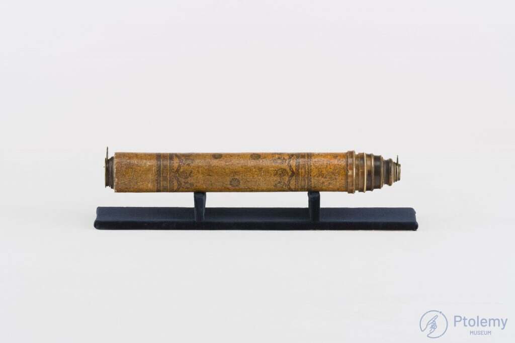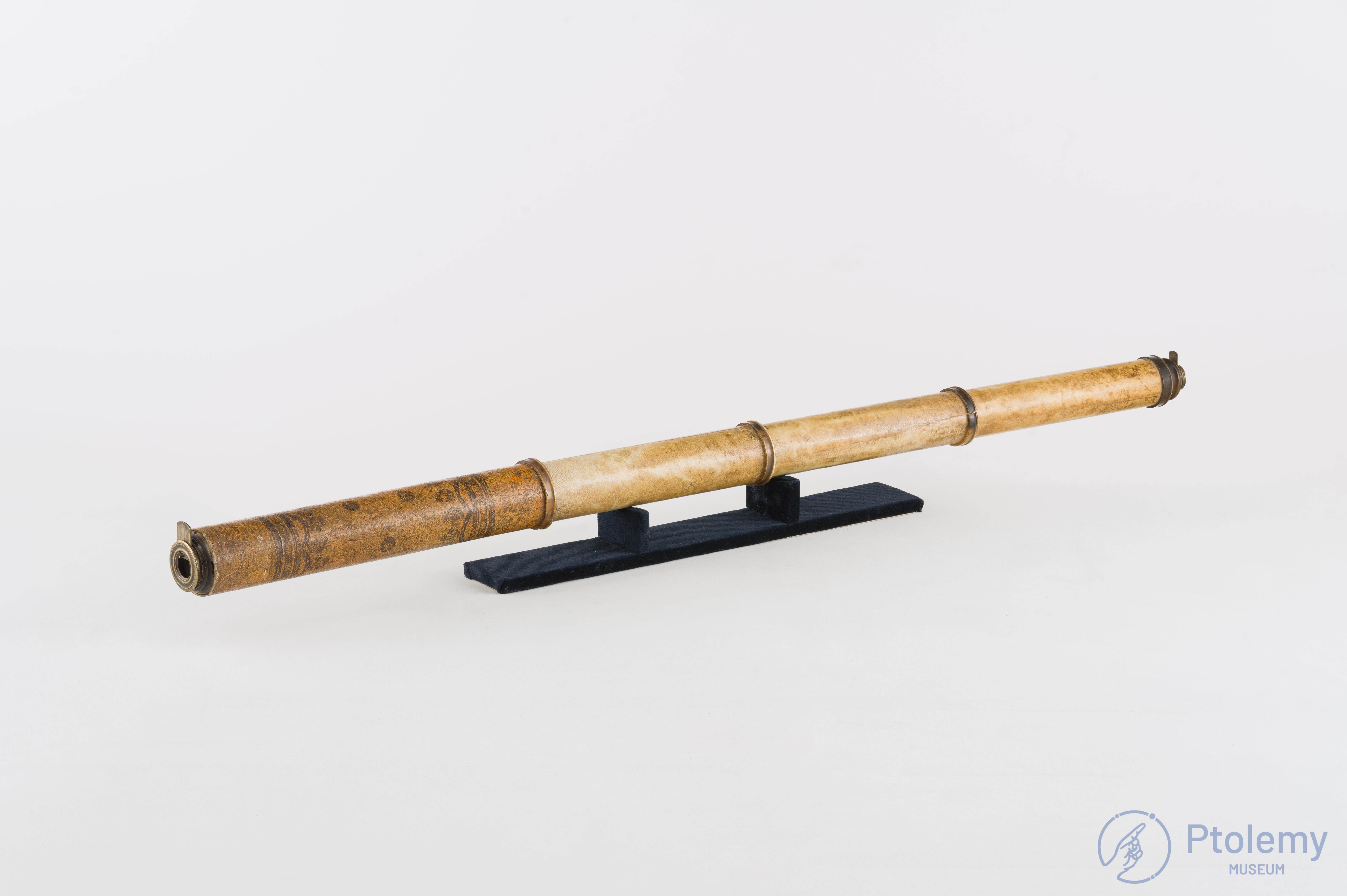這件由18世紀威尼斯著名儀器匠師比亞西奧·布爾里尼製作的三段抽拉式陸地望遠鏡,採用獨特的紙胎羊皮紙包裹工藝,管身飾有精美的壓花紋樣,並以角制與黃銅構件包邊。鏡筒上標註製作者銘文,並配有三組原裝玻璃鏡片,至今仍保持完好使用功能。作爲威尼斯洛可可時期科學儀器的代表作,它展現出實用功能與裝飾藝術的完美融合。